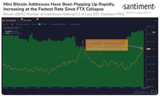 비트코인 0.1개 이하를 보유한 이들 주소는 2022년 암호화폐 시장의 침체 속에서 부진한 움직임을 이어갔으나 비트코인이 2만달러를 회복하면서 다시 증가하고 있다,