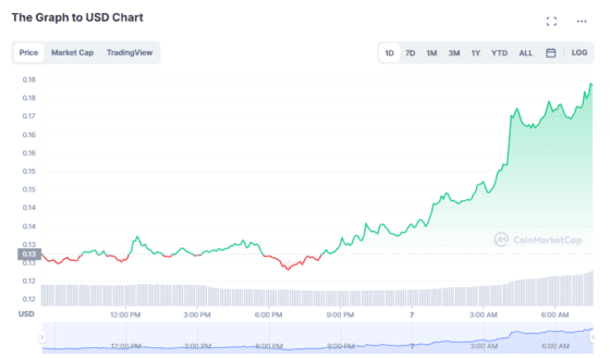 뉴욕 시간 오전 8시 45분 GRT는 코인마켓캡에서 24시간 전 대비 40.21% 오른 0.1828달러를 가리켰다.