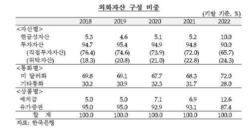 한은이 국회에 보고한 자료에 따르면 지난해말 기준으로 외화자산의 72%를 달러로 보유하고 있고 총보유자산의 87.4%는 유가증권으로 가지고 있다.
