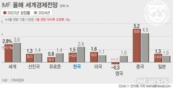 11일 기획재정부에 따르면 이날 IMF는 ‘2023년 4월 세계경제전망(WEO)’을 발표하며 올해 한국 경제 성장률을 1.5%로 전망했다.