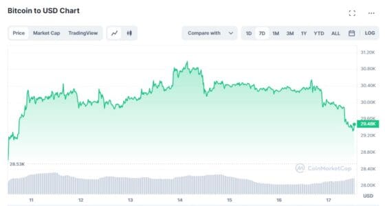 코인마켓캡 자료에서, 뉴욕시간 오후 비트코인은 24시간 전보다 3.1% 하락한 2만9421달러에 거래됐다.