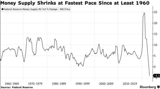 연준 통화 공급 지표인 M2의 전년 대비 증가율이 1960년 대 이후 가 전년 대비 가장 큰 폭으로 떨어졌습니다. 돈줄을 급격하게 조이고 있다는 뜻입니다.