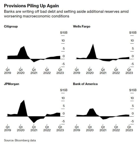 1분기 실적을 발표한 은행들은 소비자금융이 부실화될 것을 대비해서 충당금을 더 쌓고 있습니다. 캐피탈원의 경우 신용카드 부문의 손실 충당금을 전년대비 300% 넘게 더 쌓았습니다. 충당금이 팬데믹 이전 수준으로 되돌아갔습니다.