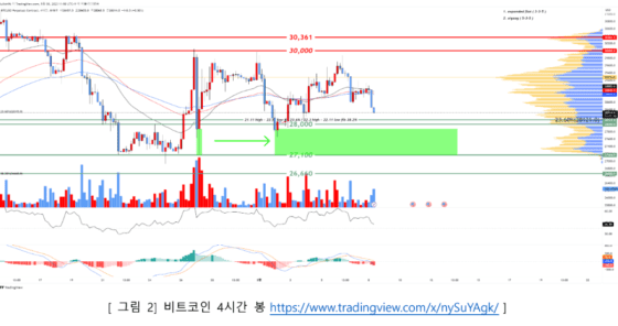 그는 “단기적을 15/30분 차트에서 상승 다이버전스가 만들어질 가능성이 있다. 해당 시그널이 뚜렷해지기 위해선 2만 8000달러를 사수해야 한다”라며, “만약 이탈될 경우 최근 거래량이 크게 발생한 초록 박스 구간(2만 7800달러~ 2만 7100달러)를 주시해야 한다”고 분석했습니다.