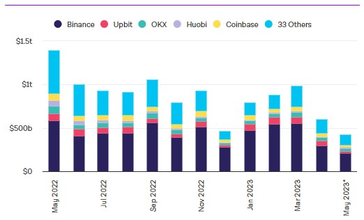 보도에 따르면, 주요 암호화폐 거래소의 5월 현물 거래량이 4240억 달러에 못미치며 2020년 10월 이후 최저치를 기록 중이다.
