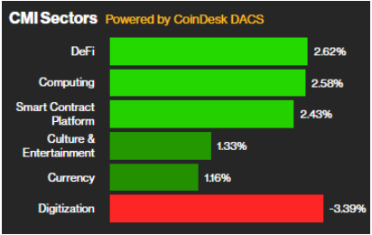 디파이는 코인데스크의 암호화폐 섹터별 주간 성적에서도 2.62% 상승, 가장 좋은 성적을 거뒀다.