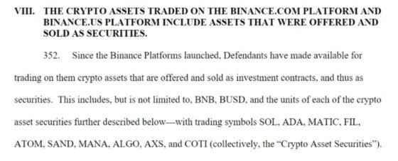 SEC는 바이낸스가 BNB, BUSD외에 솔라나(SOL), 카르다노(ADA), 폴리곤(MATIC), 파일코인(FIL), 코스모스(ATOM), 샌드박스(SAND), 디센트랄랜드(MANA), 알고랜드(ALGO), 엑시인피티니(AXS)와 다른 암호 자산 증권(통칭해서 CAS. Crypto Asset Securities)을 포함하고 있다고 설명했다.