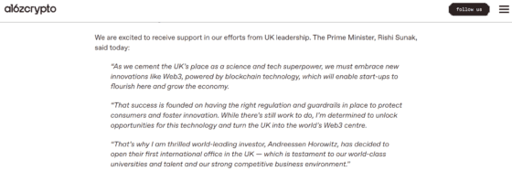 이런 상황에서 영국 리시 수낙(Rishi Sunak) 총리는 a16z의 런던 상륙을 반겼다. a16z가 공개한 영국 총리실의 축하 서한에 따르면, “영국은 과학 및 기술 강국으로서의 입지를 굳히기 위해 블록체인 기술을 기반으로 하는 Web3와 같은 새로운 혁신을 수용해야 한다”고 강조했다.