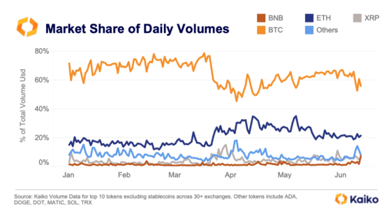 2분기 암호화폐 거래량에서 비트코인의 시장 점유율은 3월 말 최고치 대비 약 20%포인트 하락했다. 이에 비해 이더리움의 시장 점유율은 5%포인트 상승했다. 전체 거래량에서 바이낸스 BNB 토큰이 차지하는 비율은 지난 며칠간 2%에서 7% 넘는 수준으로 상승했다.
