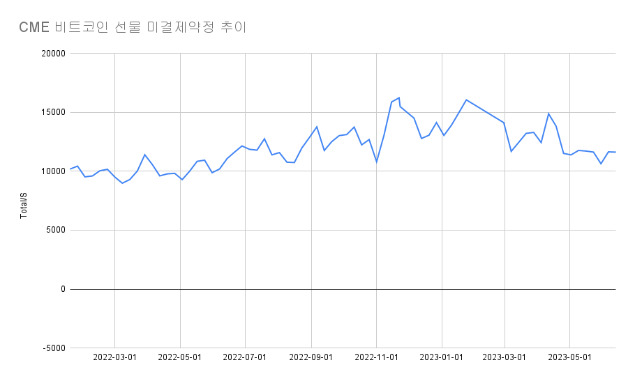 미국 상품선물거래위원회(CFTC)가 발표한 시카고상품거래소(CME) 비트코인 선물 미결제 약정은 6월 13일 기준 1만 1618건으로, 지난 발표치 대비 23건 줄었다.