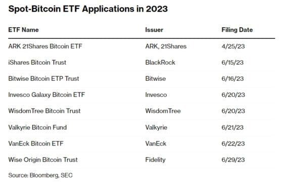 비트코인 선물 ETF는 수수료가 상대적으로 높다. 현물 가격과 괴리 가능성도 있다. 현물에 비해 유동성도 제한된다. 블랙록 등 총 8곳에서 현물 ETF를 신청했다. 8곳 모두 코인베이스와 감시공유약정을 맺었다.(아래 자료)