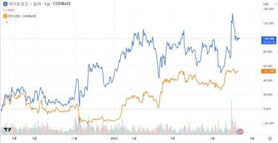 라이트코인은 다음달 반감기를 맞는다. 11일 현재 라이트코인은 지난 1년 간 라이트코인은 98% 올랐다. 같은 기간 비트코인은 52% 상승했다.(트레이딩 뷰)