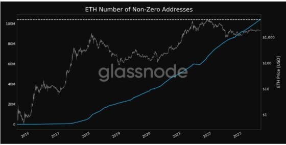 블록체인 정보 제공업체 글래스노드 자료에 따르면, 이더리움의 극히 일부분인 0.1 이더(wei) 이상 보유한 주소 수가 1억400만개를 넘어 사상 최고치를 기록했다.