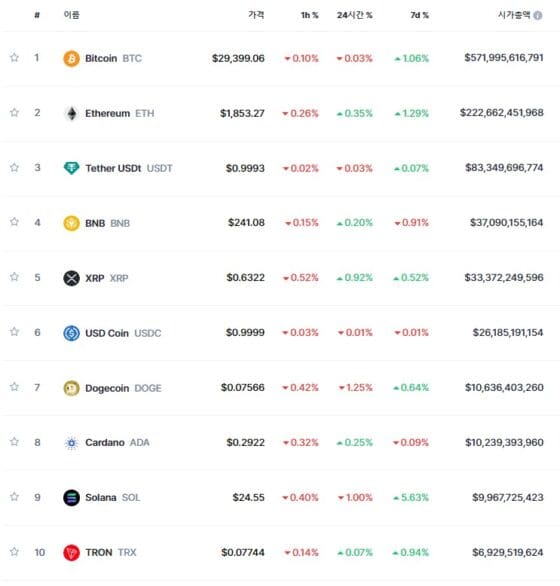 비트코인(BTC)은 2만 9399.06 달러로 전일보다 0.03% 하락했다. 2만 9000 달러에서 3만 달러 사이의 박스권을 맴돌고 있다.
