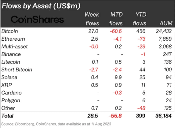 자산별로 비트코인 펀드 2700만 달러, 이더리움 펀드 250만 달러의 플러스 자금 흐름을 기록했다. XRP, 솔라나, 라이트코인에도 각기 50만 달러, 40만 달러, 10만 달러가 순유입됐다.