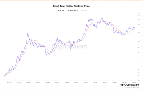 단기 보유자 실현가격은 비트코인을 155일 이내 보유한 투자자들의 평균 매입가격을 추적, 단기 보유자들의 수익 상태를 평가한다.