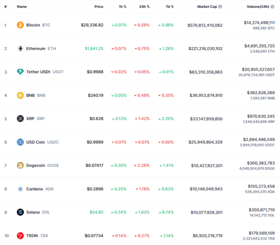 비트코인은 장중 2만9600 달러를 일시 넘어섰지만 상승 흐름을 계속 이어가지 못했다. 이 시간 비트코인은 2만9336.82 달러로 24시간 전 대비 0.29% 내렸다. 뉴욕장 초반과 비슷한 가격이다. 이날 비트코인의 장중 고점은 2만9660.25 달러로 기록됐다. 이더리움은 1841.25 달러로 0.75% 후퇴했다. XRP는 1.42% 내린 0.628 달러를 가리켰다. 솔라나가 1.03% 올랐고 나머지 주요 코인들은 하락했다.