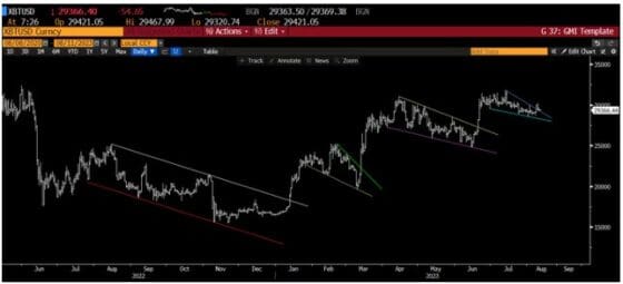 먼저 비트코인의 경우 차트에서 분명히 계단식 상승 추세를 보이고 있으며, 곧 더 큰 상승 단계에 근접한 것으로 보인다.