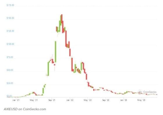 액시 인피니티의 자체 코인 AXS 가격 또한 2021년 11월 최고가 164.90달러에 비해 현재 97% 하락했다.