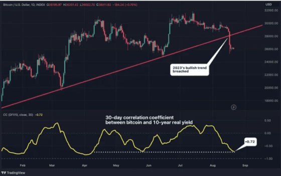 두 자산의 현재 상관관계는 전통금융과 거시적 요소들이 다시 비트코인 가격에 영향을 미치고 있음을 의미한다. 지난달 비트코인 현물 ETF의 잠재적 승인을 둘러싼 낙관론이 고개를 들며 비트코인과 미국 실질금리의 역상관관계는 붕괴됐었다.