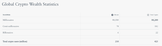 또 1억 달러 이상의 암호화폐 자산을 가진 센티-밀리어네어(슈퍼-백만장자)는 182명, 10억 달러 이상의 억만 장자는 22명으로 조사됐다. 그 중 비트코인을 보유한 사람은 절반 수준으로, 각각 78명과 6명으로 나타났다.