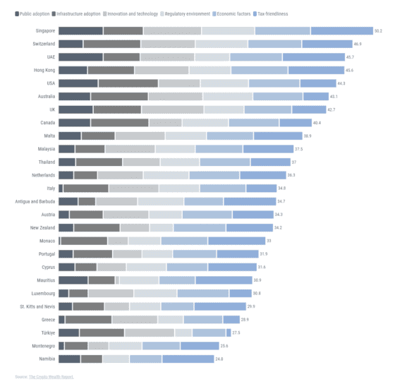 싱가포르는 인프라 수준, 기술혁신, 규제환경, 경제요소, 세제 측면 등 6개 부문에서 고점을 받아 총 50.2점으로 전세계 최고의 암호화폐 대중화 국가로 꼽혔다.