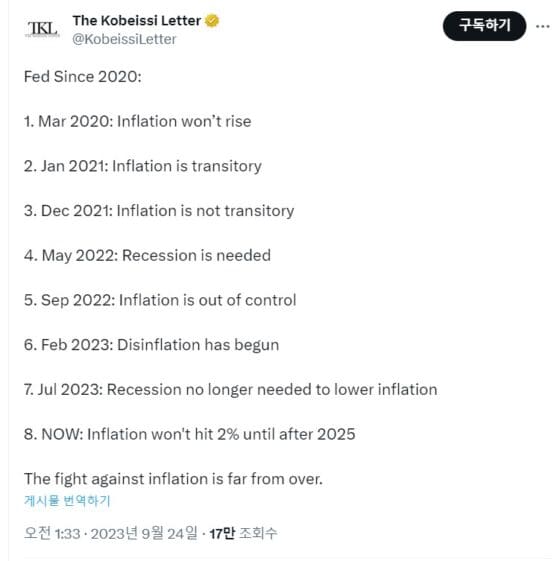 [블록미디어 이제인 기자] 코베시레터(KobeissiLetter)가 연준을 비판했다. 인플레이션 대응에 갈팡질팡하고 있다는 것.