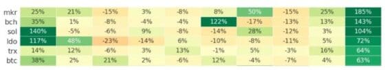 비트코인캐시는 6월에만 122%라는 의미 있는 가격 상승을 기록했으며, 솔라나는 올해 첫 달에 140% 가격이 올랐다.