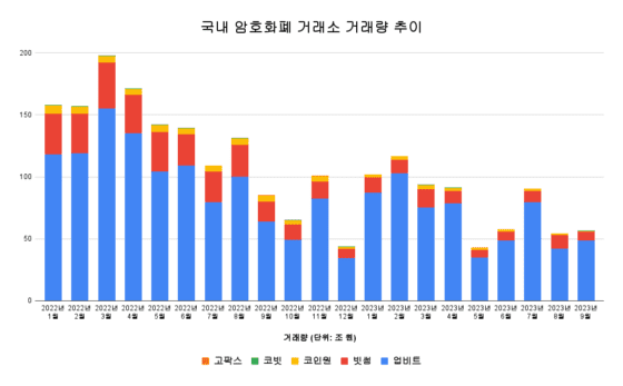 9월 업비트 거래량은 48조 6819억 원, 빗썸 6조 7809억 원, 코인원 9022억 원, 코빗 925억 원, 고팍스 1139억 원을 기록했다.