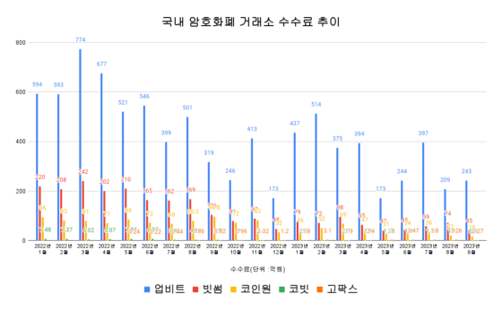업비트 244억 원(209억 원), 빗썸 44.7억 원(73.6억 원), 코인원 18억 원(21억 원), 코빗 0.92억 원(1.19억 원), 고팍스 2.27억 원(3.26억 원)으로 수수료가 추정된다. (괄호 안은 전월)