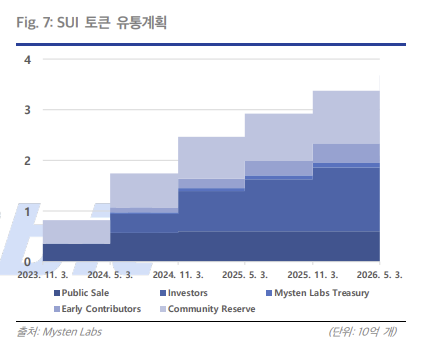 지난 5월 수이를 상장한 업비트가 제작한 보고서에는 ‘SUI 토큰 유통계획’ 항목이 있다. 업비트에서 확인 가능하다.