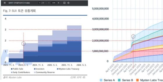 [블록미디어 정아인 기자] 업비트에 올라와 있는 수이(SUI) 관련 가상자산보고서 상의 토크노믹스와 수이 재단이 공시한 유통량 계획서 상의 숫자가 다른 것으로 확인됐다.