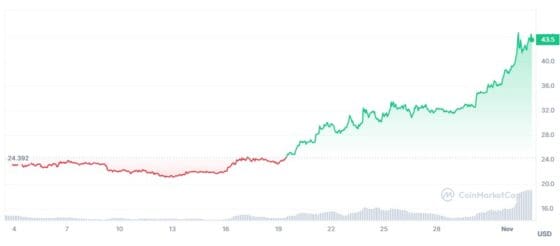 2일(현지시간) 지크립토에 따르면, 솔라나는 지난 24시간 동안 13.6% 이상 급등하며 최고 46달러를 기록했는데, 이는 2022년 8월 이후 가장 높은 수준이다.