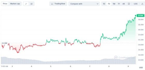 코인마켓캡에서 뉴욕시간 오전 비트코인은 24시간 전보다 4.8% 오른 3만7102 달러에 거래됐다.