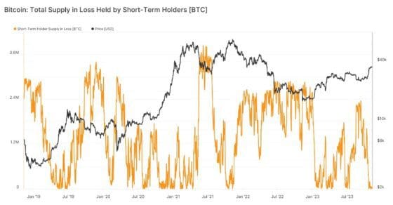 한편 글래스노드 자료에서, 단기 보유자의 공급 손실은 최저치를 기록했다. 이는 단기 보유자 집단에 속하는 거의 모든 투자자가 수익 상태에 있다는 사실을 보여준다.