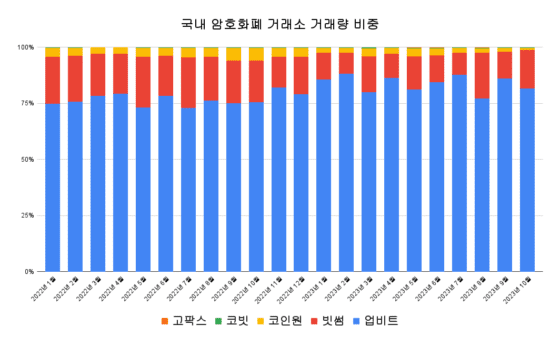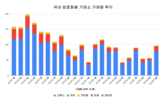 10월 업비트 거래량은 78조 5180억 원, 빗썸은 16조 6251억 원, 코인원 9465억 원, 코빗 1575억 원, 고팍스 632억 원을 기록했다.