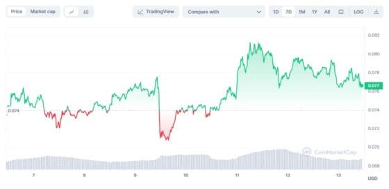 코인마켓캡에서, 뉴욕시간 오전 도지코인은 24시간 전보다 2.6% 하락하고, 일주일 전에 비해 3.5% 오른 0.08 달러에 거래됐다.
