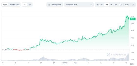 13일(현지시간) 코인마켓캡에서, 파일코인은 24시간 동안 13%, 일주일 전에 비해 25% 상승했으며, 월간 수익률이 60%를 넘어섰다.