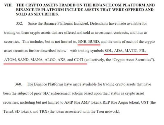 SEC는 BNB, BUSD의 발행 과정을 상세하게 기술하면서 미국 법을 위반했다고 강조했다. 바이낸스에서 취급한 솔라나, 카르다노, 폴리곤, 파일코인, 샌드막스, 디센트럴랜드 등 특정 코인에 대해서도 각각 누가, 언제, 어떻게 발행을 했는지 소장에 일일이 열거했다. 이들이 모두 증권이라는 것.