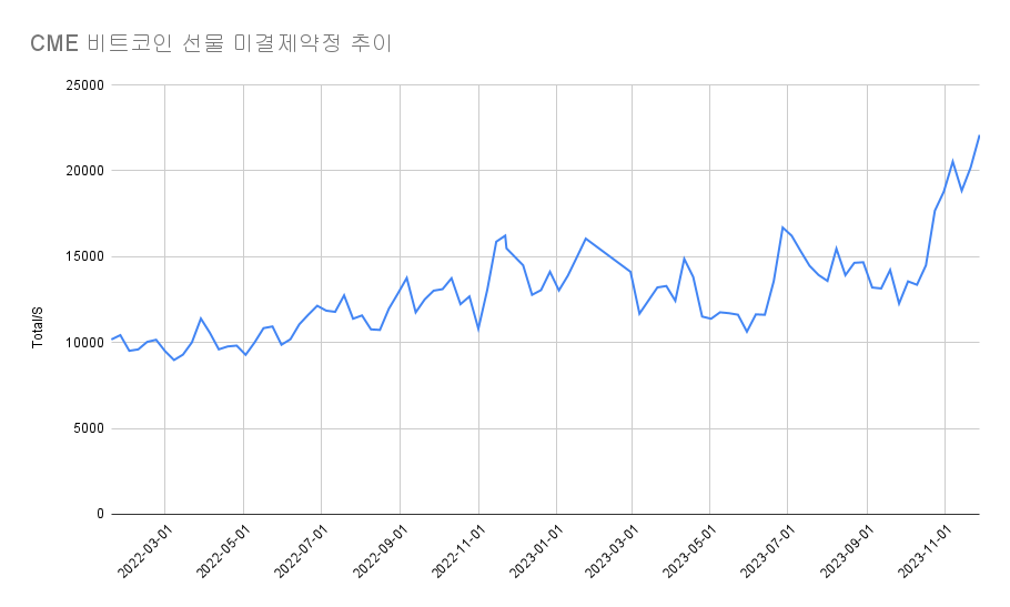 미국 상품선물거래위원회(CFTC)가 발표한 시카고상품거래소(CME) 비트코인 선물 미결제 약정은 11월 28일 기준 2만 2092건으로, 직전 발표치 대비 1891건 늘었다.