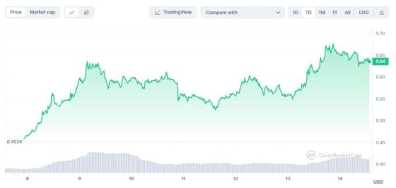 14일(현지시간) 오후 카르다노는 24시간 전보다 3.2%, 일주일 전에 비해 40.1% 상승한 0.64 달러에 거래됐다.