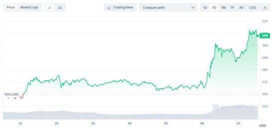 BNB는 지난달 미국 증권거래위원회(SEC)의 규제 압력으로 창업자 겸 CEO 창펑 자오가 갑작스럽게 사임하는 등 혼란을 겪으며 225 달러까지 떨어지는 등 하락세를 이어갔다.