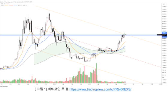 비트코인 현물 ETF라는 호재를 제외하면 기술 분석 관점에서는 추세가 될 수 있는 변곡 구간입니다.