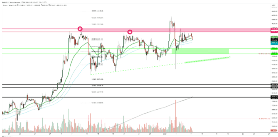 송 애널리스트는 “안착하기 전까지는 추가 조정이 발생할 수 있는 흐름을 주의할 필요가 있다”라며, “추가 조정 발생 시 아래 4만 2700 ~ 4만 2200 달러 구간에서 지지받고 이전 41K 구간 저점 매물대보다 한 단계 높여 저점 매물대를 형성하는 것이 중요하다. 실패했을 땐 최후로 어센딩 구조의 상승 추세를 유지해야 한다”라고 조언했습니다.