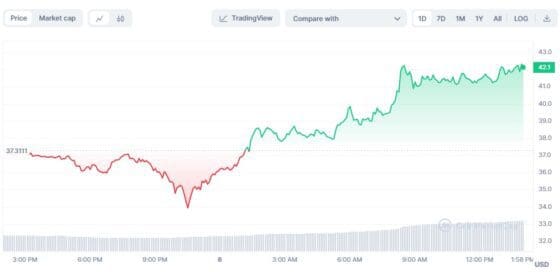 코인마켓캡에서 뉴욕시간 오후 인젝티브는 24시간 전보다 13% 상승한 42.2 달러에 거래됐다.