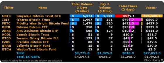 블룸버그 인텔리전스의 ETF 애널리스트 제임스 세이파트에 따르면 비트코인 현물 ETF는 출시 후 첫 3일 동안 97억 달러가 넘는 거래량을 기록했다.