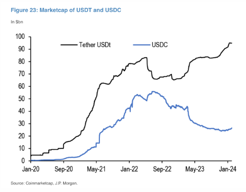 [뉴욕 = 장도선 특파원] 스테이블코인 시가총액의 최근 성장세는 고무적이지만 스테이블코인 시장에서 테더(USDT)의 지배력 확대는 우려를 제기한다고 JP모건이 지적했다.