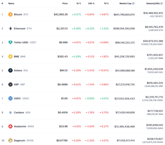 이 시간 비트코인은 4만2905.29 달러로 24시간 전 대비 0.84% 내렸다. 이더리움은 2331.13 달러로 0.32% 전진했다. 시총 10위에 포함된 다른 알트코인들은 24시간 전 대비 모두 하락했다. BNB 0.12%, 솔라나 3.43%, XRP 1.14%, 카르다노 1.76%, 아발란체 4.50%, 도지코인 2.34% 후퇴했다. 최근 랠리를 펼쳤던 시총 11위 체인링크는 18.72 달러로 4.43% 내렸다.