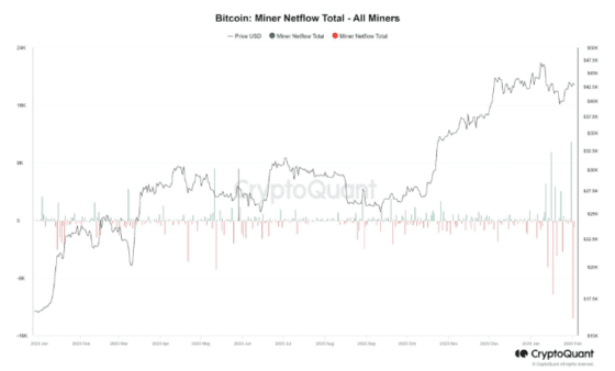 글래스노드에 의하면 비트코인 현물 ETF 출시 다음날인 1월 12일 채굴자들은 10억 달러 넘는 비트코인을 거래소로 전송했다. 이는 6년래 최대 규모의 채굴자 잔고 유출이며 그날 비트코인은 거의 9% 급락했다. 2월 1일에도 1만3500 BTC가 채굴자 지갑을 떠난 것이 목격됐다.