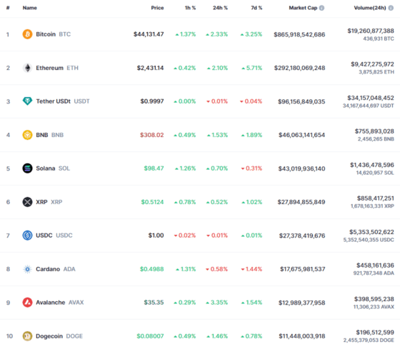 [뉴욕 = 장도선 특파원] 암호화폐 시장이 7일(현지시간) 비트코인과 이더리움의 선도로 상승 흐름을 연출했다. 비트코인은 4만4000 달러를 돌파했고 이더리움은 2400 달러를 넘어섰다.